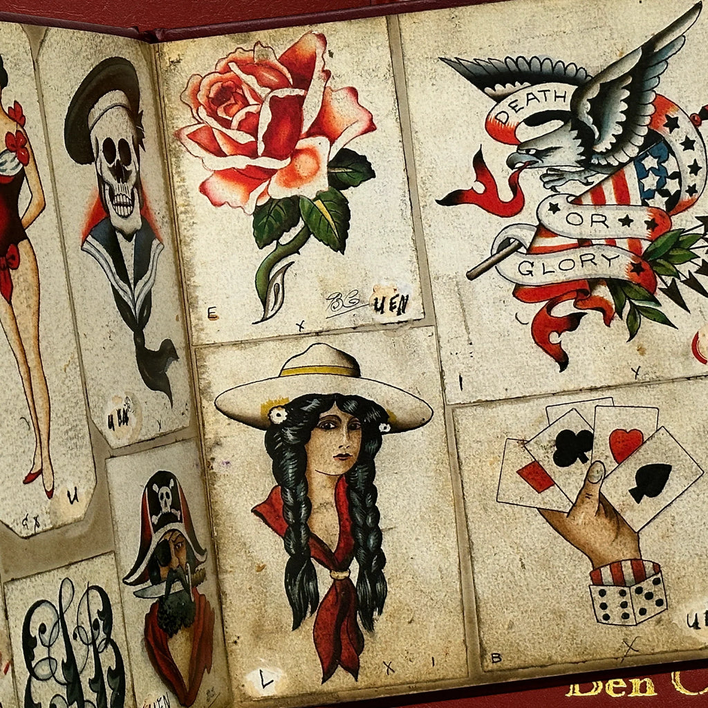 Tattoo Travel Book, published by Don Ed Hardy, is an elegant hardcover facsimile of an actual album of tattoo flash that Ben Corday made for himself while he was on the road as a tattoo artist and carnival tall man. These fine-line ink and watercolor designs, created in the 1910s and early 1920s, were painted individually and glued into a leather-bound souvenir photo album. Tattoo Travel Book contains 26 pages of that flash reproduced in the original size.
