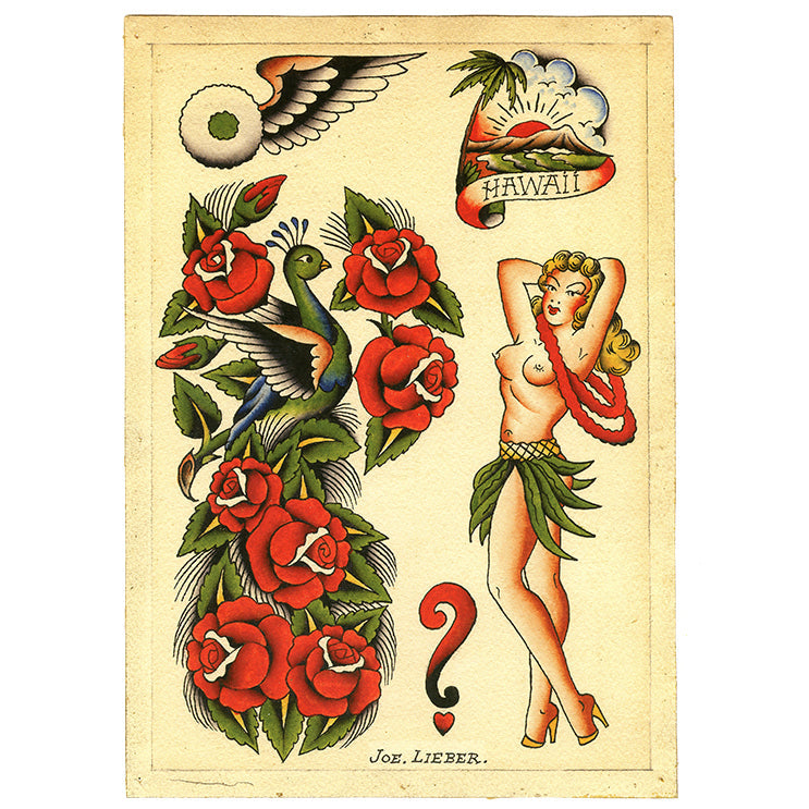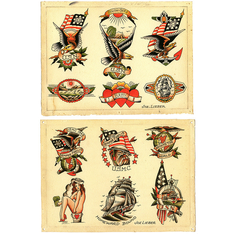 Brooklyn Joe Lieber - American Tattoo Master: This is simply one of the best historic Traditional Flash books I have ever seen. This is a book which rivals the classic Sailor Jerry volumes and will surely become a classic very soon. The designs are beautifully drawn and painted very much in the style of Sailor Jerry but with Brooklyn Joe's style printed on them. Brooklyn Joe Lieber worked in the very early 1900s and seems to be the tattooer who first came along with what we know as the Sailor Jerry style and Jerry never credited Joe for this. Amazing designs with real class!!! Over 100 sheets shown!!