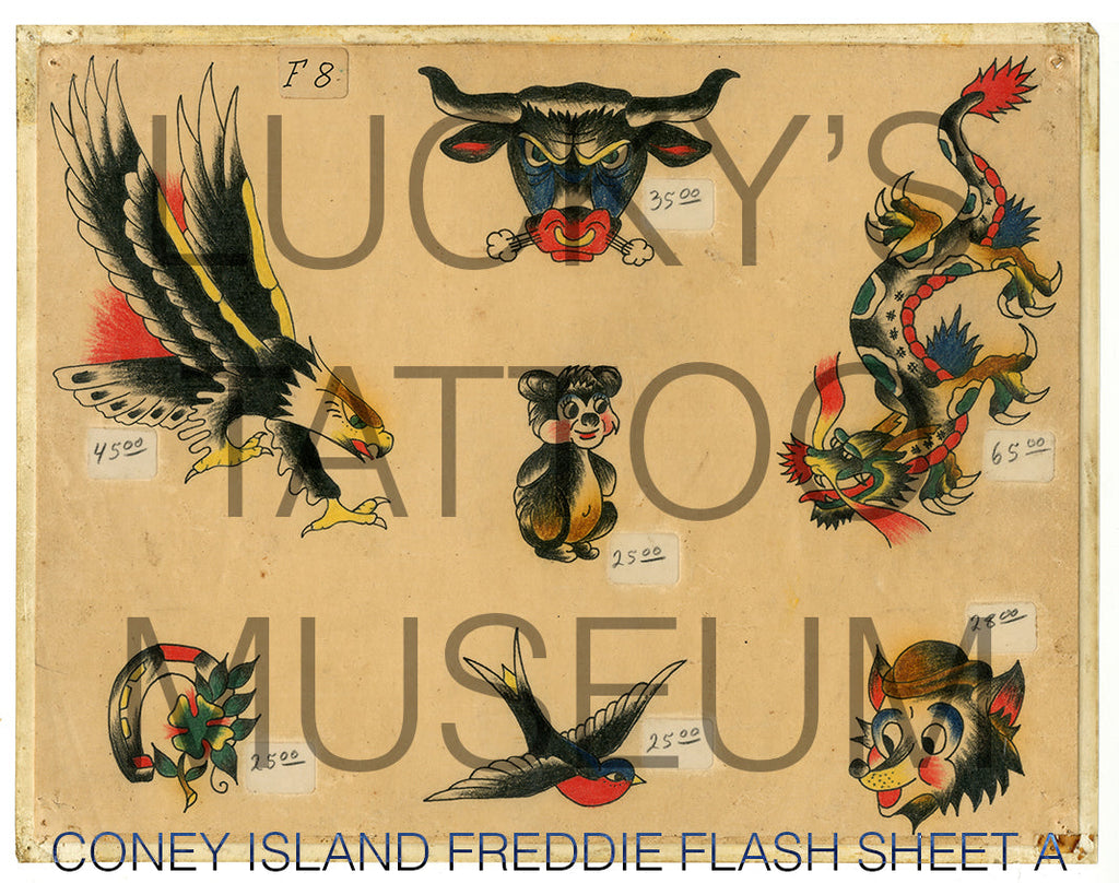 We're excited to offer high-quality prints of traditional flash artwork from some of the most respected names in tattoo history. Each 11" x 14" piece is printed on heavy watercolor paper and available framed or unframed. These images come straight from the Lucky Supply Tattoo Museum archives—real-deal flash that helped shape the industry.