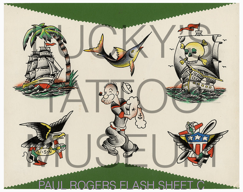 We're excited to offer high-quality prints of traditional flash artwork from some of the most respected names in tattoo history. Each 11" x 14" piece is printed on heavy watercolor paper and available framed or unframed. These images come straight from the Lucky Supply Tattoo Museum archives—real-deal flash that helped shape the industry.