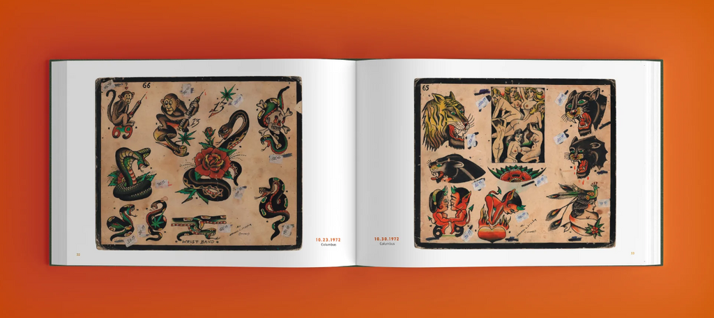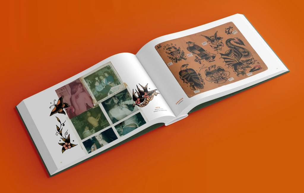100+ - 12x8 offset printed pages of tattoo flash photos, personal and professional effects from Stoney’s life and work. On premium quality matte 100lb paper with a high-quality, flexible lay-flat stitch binding with an debossed fabric cover.