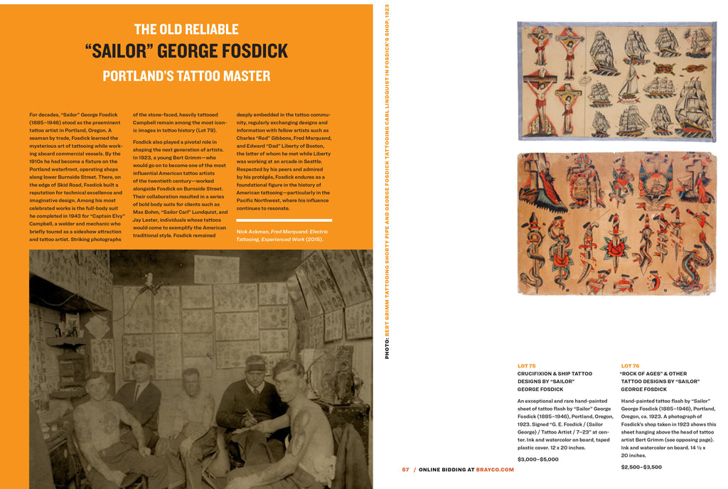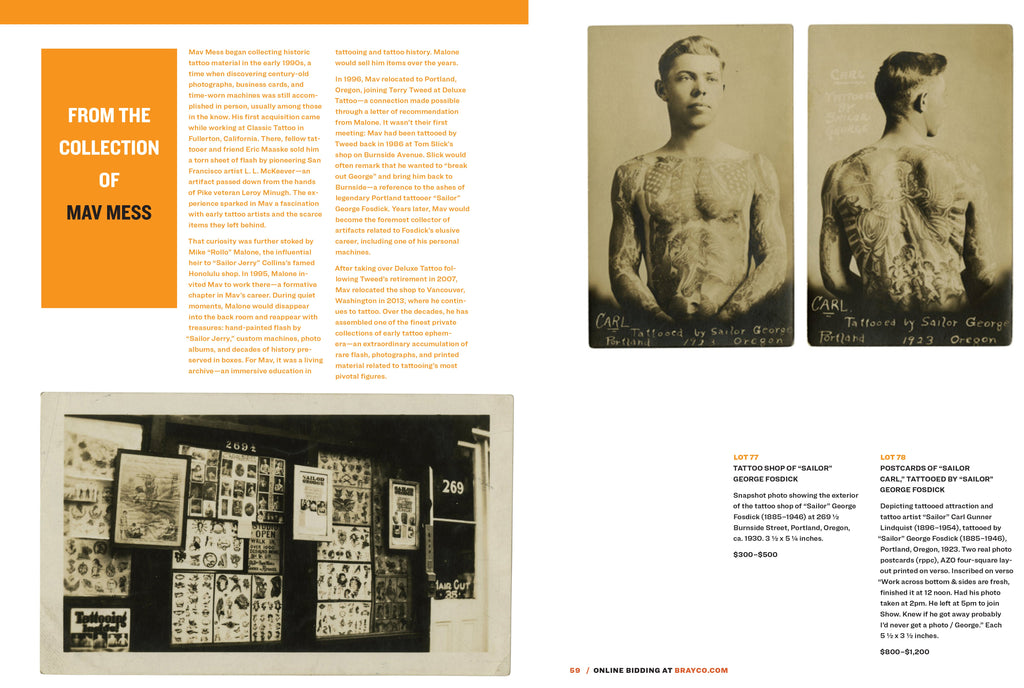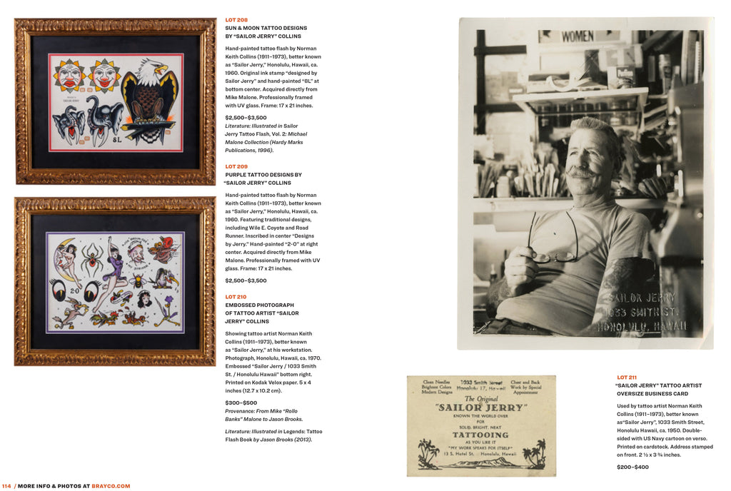 This catalogue represents the largest and finest collection of tattoo masterworks and related artifacts ever offered for public sale. It is a companion to an auction held by Bray & Co. on July 13, 2025.
